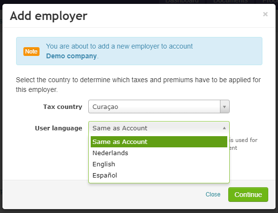 The general ledger codes, but for example also the names of the payment schedules, in each new payroll/employer are generated in the language chosen while creating this new employer. If the account language is set on English and you choose the option 'Same as Account' on top in the screen below, the general ledger codes will be generated in English.