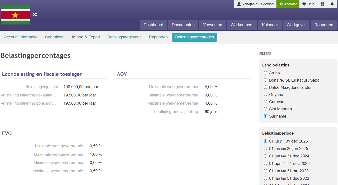 De verschuldigde percentages die van toepassing zijn kunt u vinden in Account / Belastingpercentages: